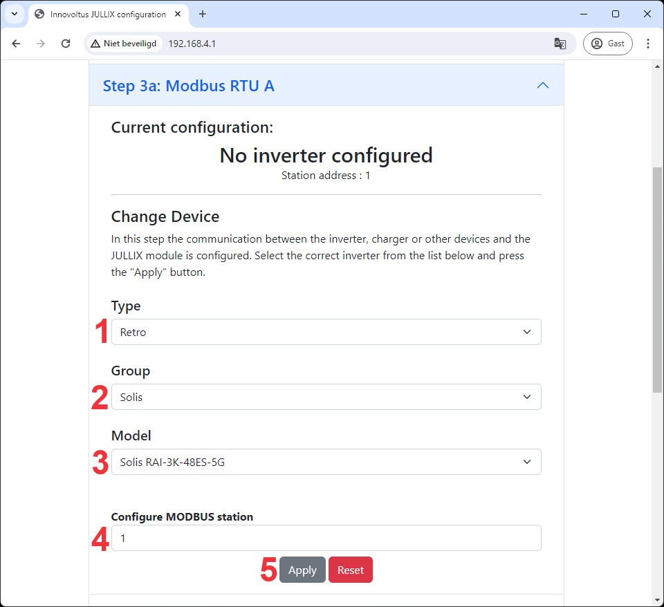 In de Jullix of Extender moet de omvormer communicatie nog geconfigureerd worden. Wanneer je een SOLIS retro omvormer gebruikt, dan kies je in de modbus RTU configuratie bij Type: Retro (1) in de Group kies je Solisr (2). Vervolgens kies je het juiste model, Solis RAI-3K-48ES-5G (3). In Configure modbus station stel je het juiste modbus adres in; meestal is dit 1 (4). Via Apply (5) worden de instellingen bewaard.