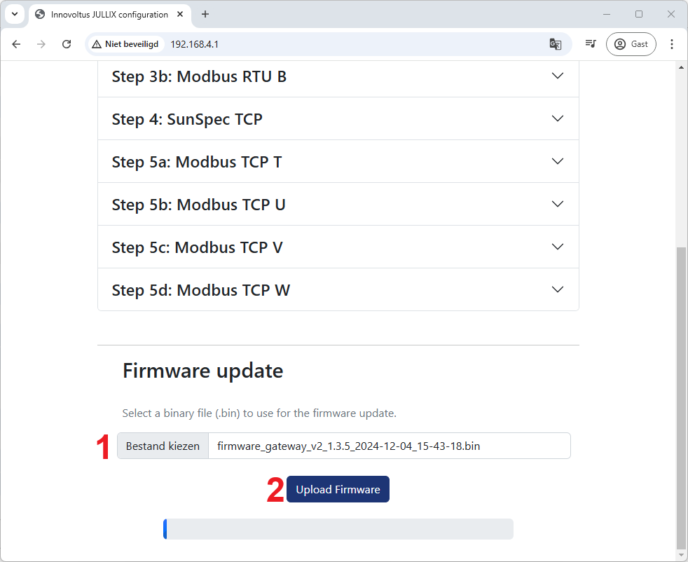 Als je de firmware gedownload hebt, kan je wanneer je directe verbinding maakt met Jullix, de firmware uploaden.