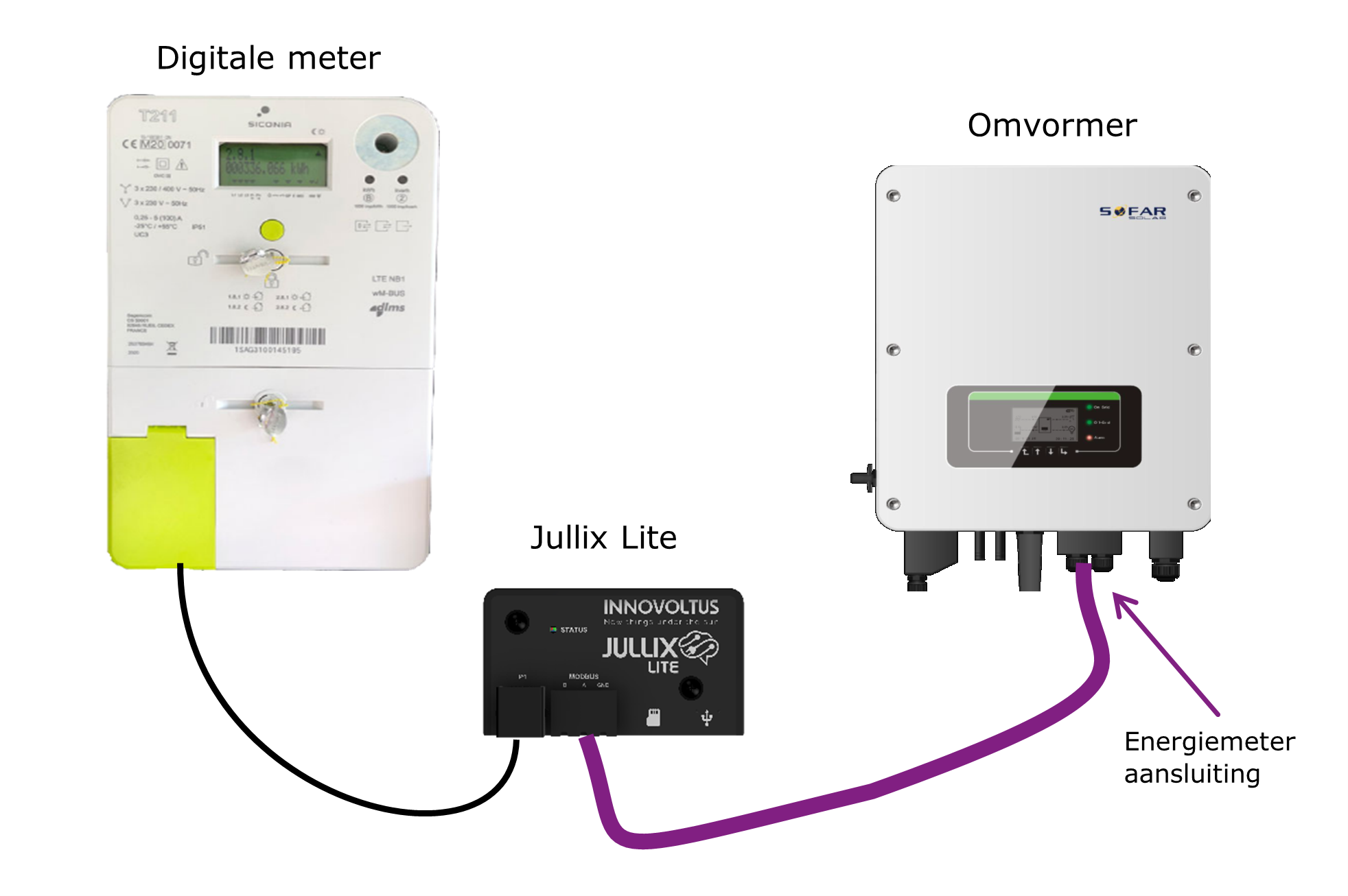 Als de omvormer ondersteund is, verbind je de RS485 van de Jullix Lite met de RS485 Meter van de omvormer. De RS485-kabel van het apparaat wordt aangesloten aan de meegeleverde schroefplug.