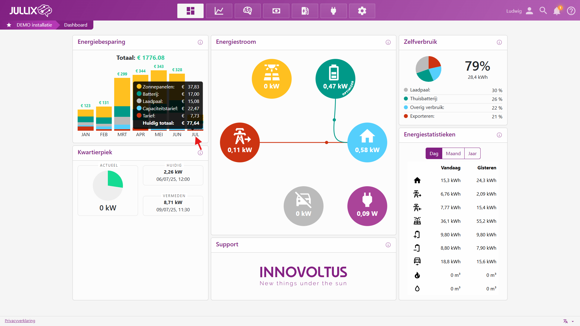 De berekening van de energiebesparing op je energiefactuur is alleen mogelijk als het Jullix-EMS een volledig beeld heeft van de installatie. Dat betekent dat alle batterij- en PV-omvormers in het systeem geïntegreerd moeten zijn..
