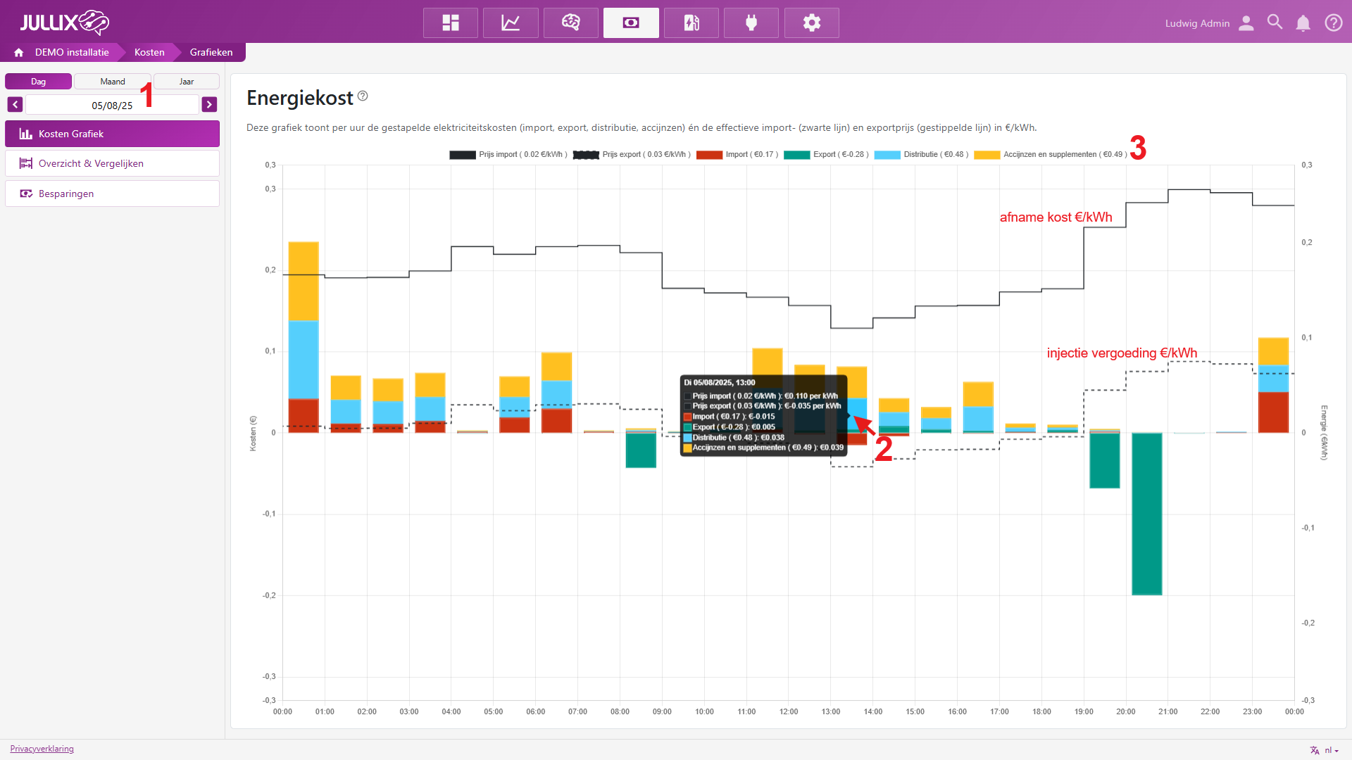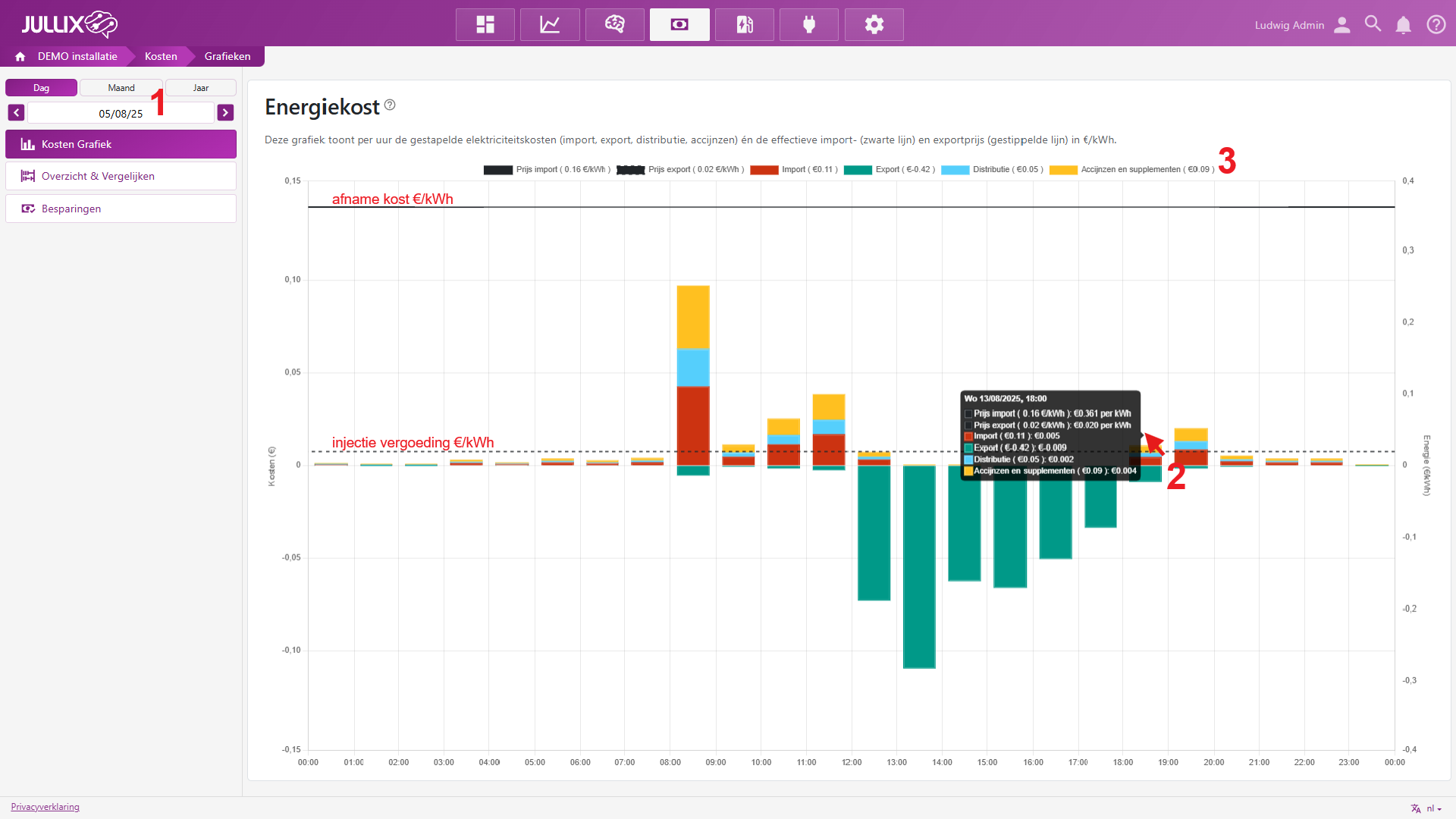 In de legende 3 zie je de gemiddelde kWh prijs voor de afname kost(Prijs import) en de injectie vergoeding(Prijs export). Je vindt er ook de totale kost (€ ) per rubriek:Afname, Injectie, Distributie, Accijnzen en supplementen voor de gekozen periode; dag, maand of jaar.