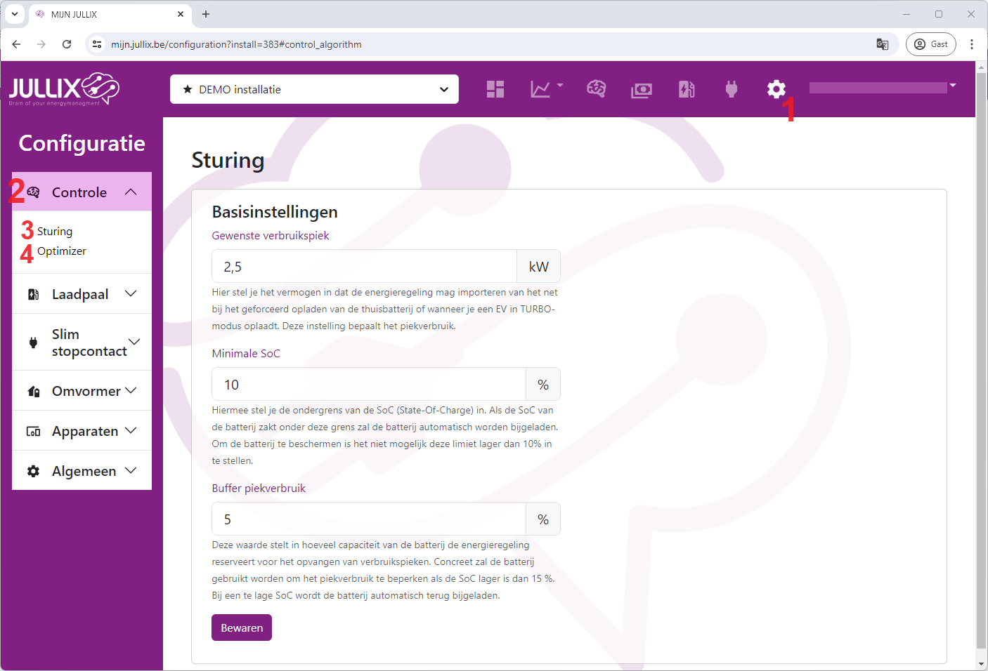 De instellingen van de Optimizer vind je op de configuratiepagina onder de Controle. Je kan een aantal parameters instellen die de energieregeling van je installatie beïnvloeden. Deze pagina bereik je via Configuratiepagina (1) van de installatie, onder de sectie Controle (2).