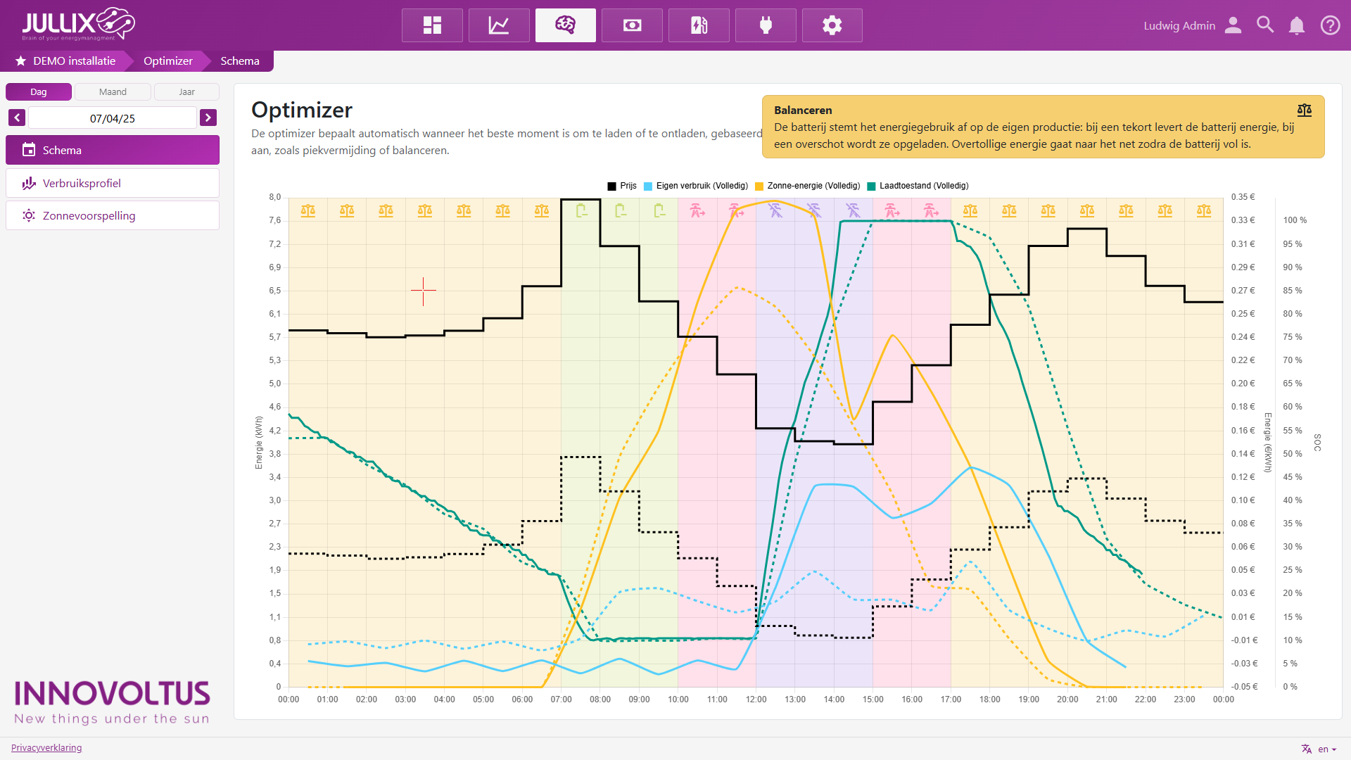 De gekleurde vlakken in het schema duiden op de verschillende regelmodi die de Jullix Optimizer ter beschikking heeft. Als je met de muis over de vlakken beweegt, krijg je rechtsboven een korte uitleg over de regelmodus.