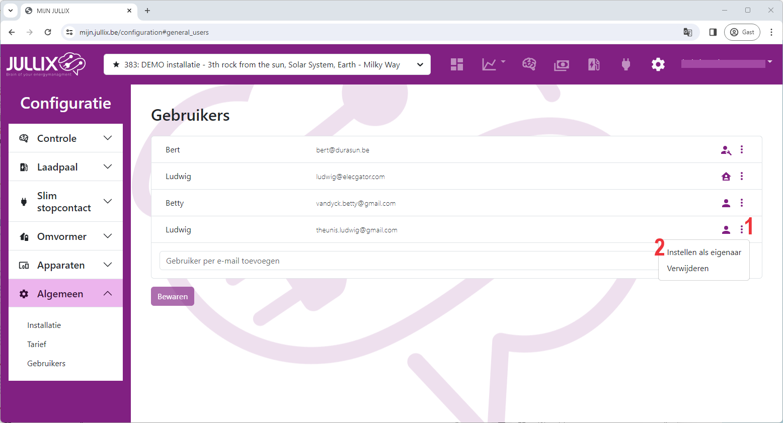 Bij het initieel aanmaken van een installatie is het belangrijk dat de juiste persoon als eigenaar ingesteld wordt. De eigenaar kan de installatie aanpassen en beheren. Andere gebruikers kunnen dat niet. In de configuratie pagina bij algemeen>gebruikers kan je via het menu bij de gebruiker(1) in de gebruikers lijst een bepaalde gebruiker als eigenaar instellen(2).