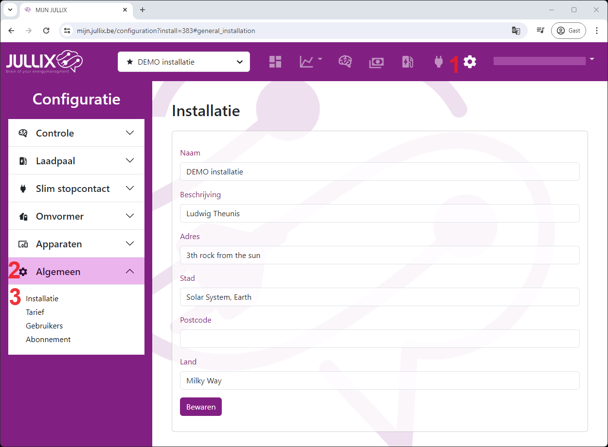 De andere instellingen van de installatie vind je bij settings Configuratie(1) van de installatie, onder de sectie Algemeen(2) bij Installatie(3).