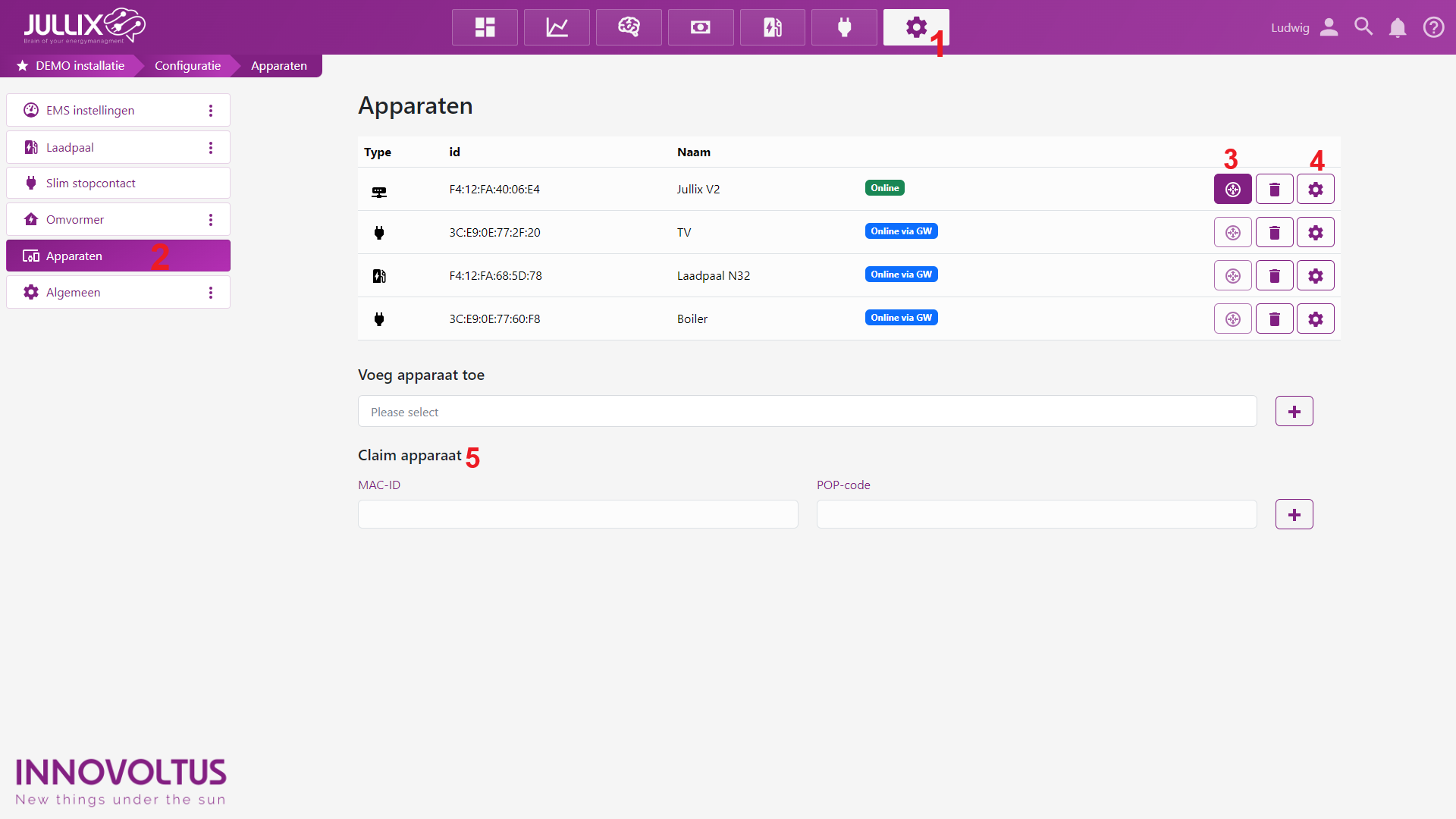 Als je nieuwe apparaten hebt gekoppeld aan je Jullix (Gateway) dan moet je die hier ook Claimen en toevoegen (5) via de knop