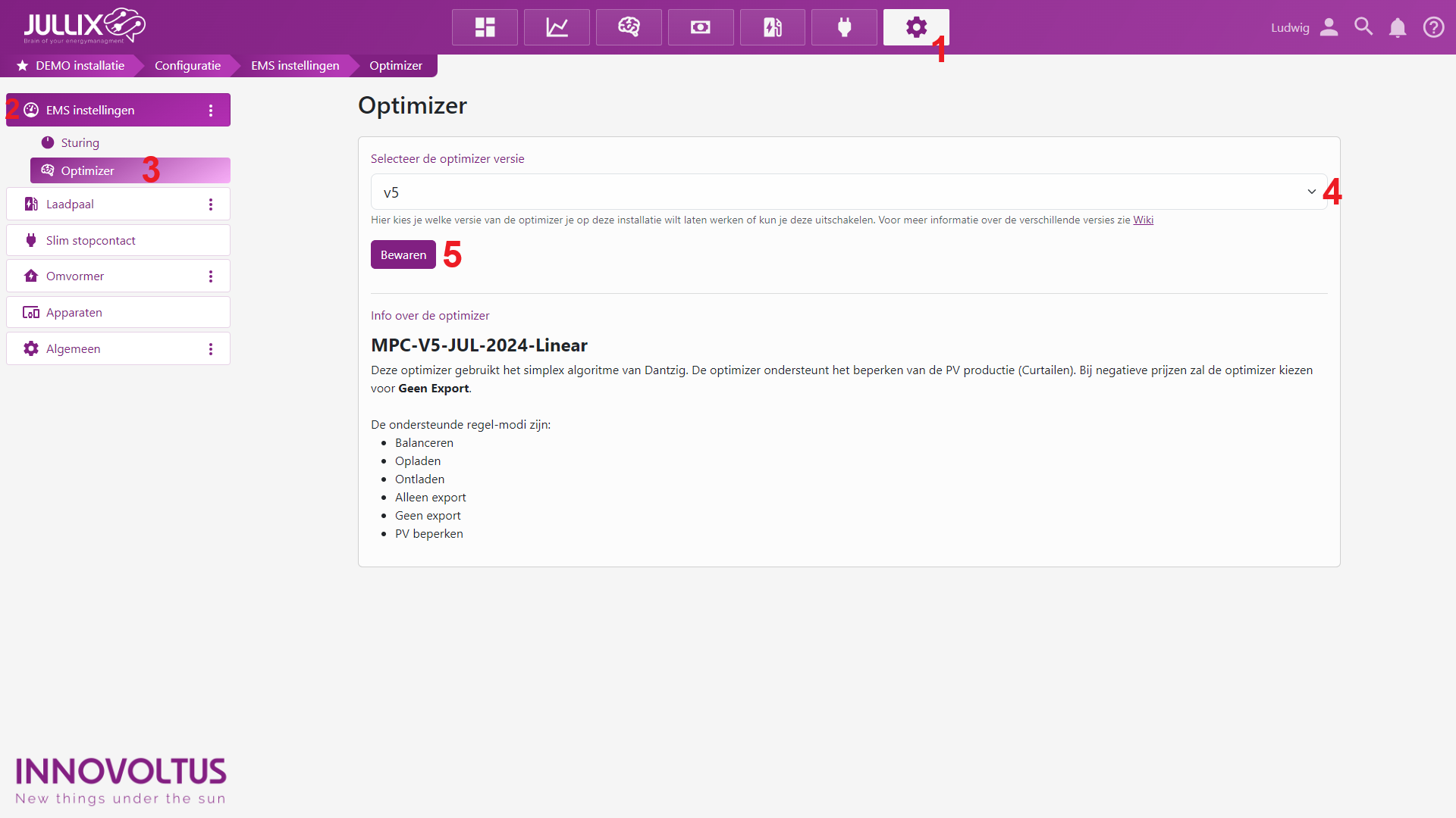 Bij Selecteer de optimizer versie (4) kan je de Jullix EMS Optimizer inschakelen door een versie te kiezen. Hoe hoger de versie, hoe beter de optimizer. Welke versie je kan kiezen, hangt af van welke firmware er op Jullix draait. Nadat je de Optimizer versie hebt gekozen, schakel je met een klik op Bewaren (5) de Optimizer in of uit.