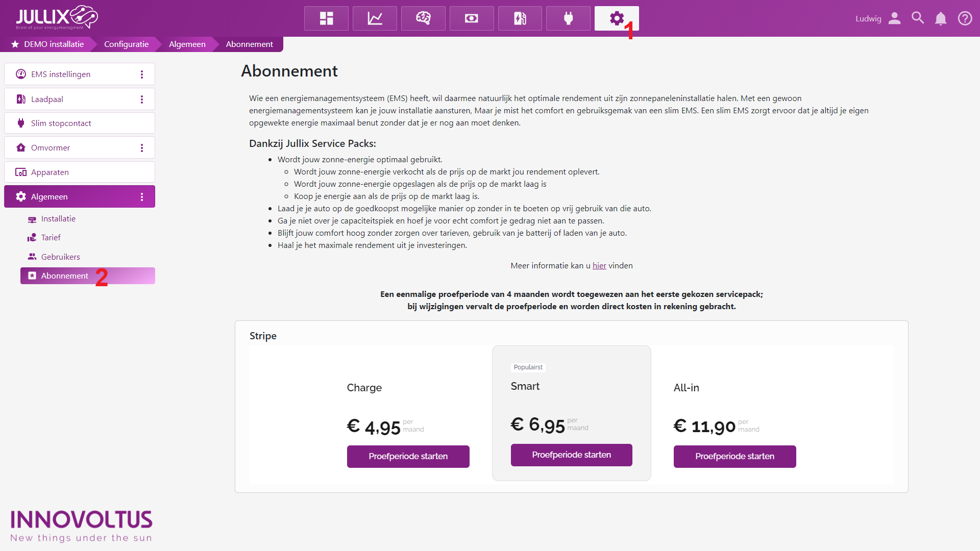 Kies je geen abonnement dan werkt de Jullix EMS in modus “Free”. Het Jullix EMS gebruikt de batterij dan standaard in Balanceer mode. Teveel aan energie wordt in de batterij gestopt, te kort aan energie wordt uit de batterij gehaald. Op het platform kan je enkel de realtime data bekijken. Je kan geen grafieken van de historische data bekijken, je krijgt geen kosten berekeningen te zien.