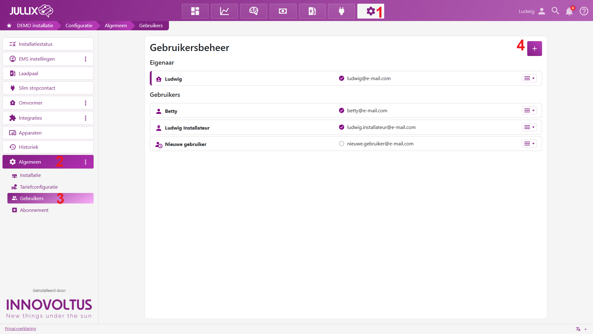 Bij gebruikers kan je beheren wie er toegang heeft tot je installatie via het portaal of de app. Je bereikt deze pagina via Configuratie (1) van de installatie , onder de sectie