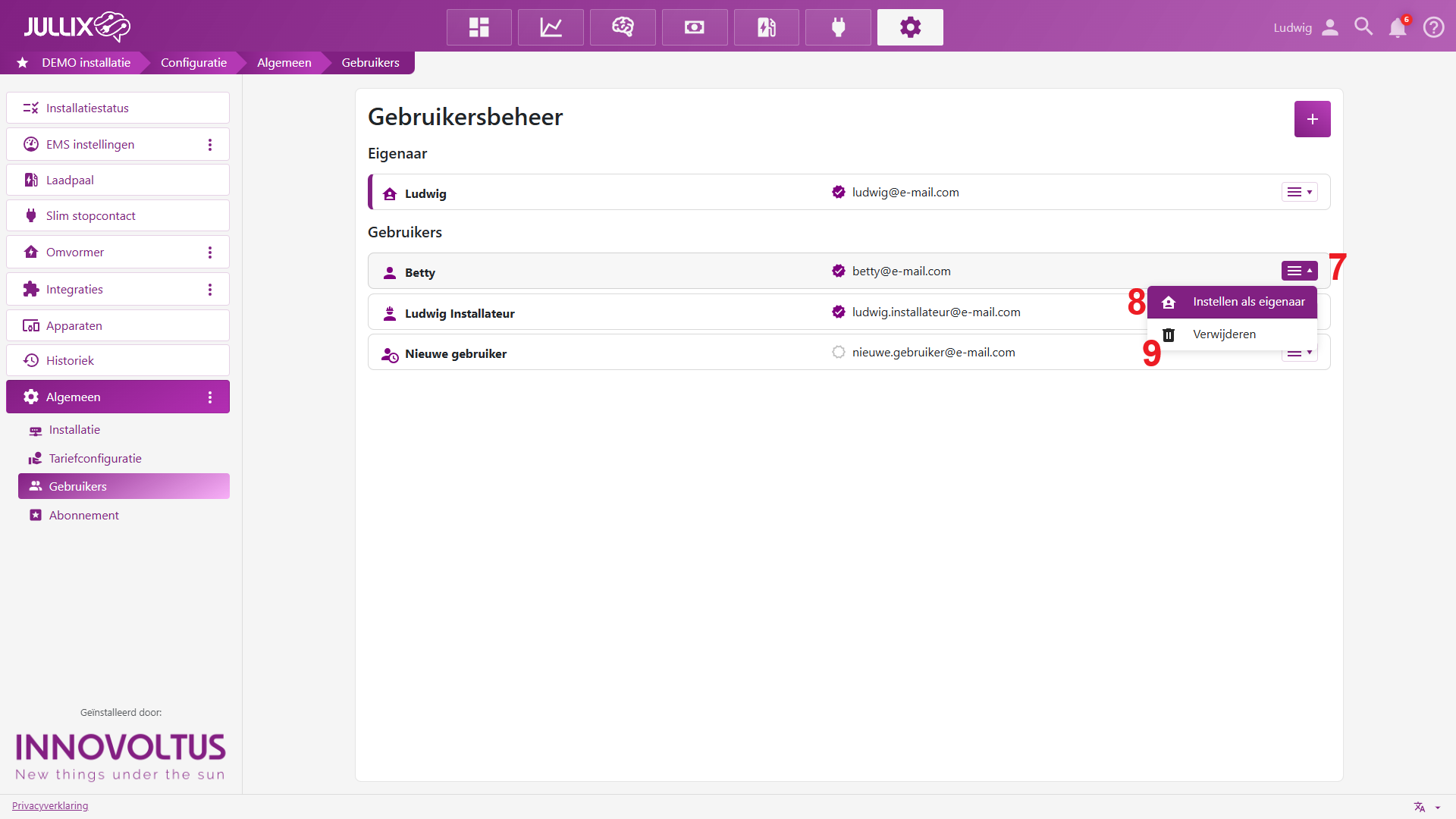 Bij het initieel aanmaken van een installatie is het belangrijk dat de juiste persoon als eigenaar ingesteld wordt. De eigenaar kan de installatie aanpassen en beheren. Andere gebruikers kunnen dat niet.