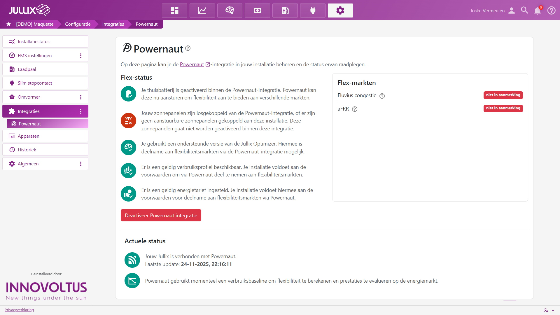Als je de Powernaut integratie hebt geactiveerd krijg je onmiddellijk een zicht op de Flex-status. Je krijgt te zien met welke assest je kan deel nemen en welke niet. Er zal getracht worden om een verbinding te maken met het Powernaut platform. Als ook je EAN nummer correct ingeven zal van zodra er ook effectief een verbinding is met het Powernaut platform dit weergeven en zal je da in de Actuele status zien.