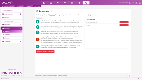 Integraties (2) kan je de Powernaut (3)-integratie instellen en monitoren.