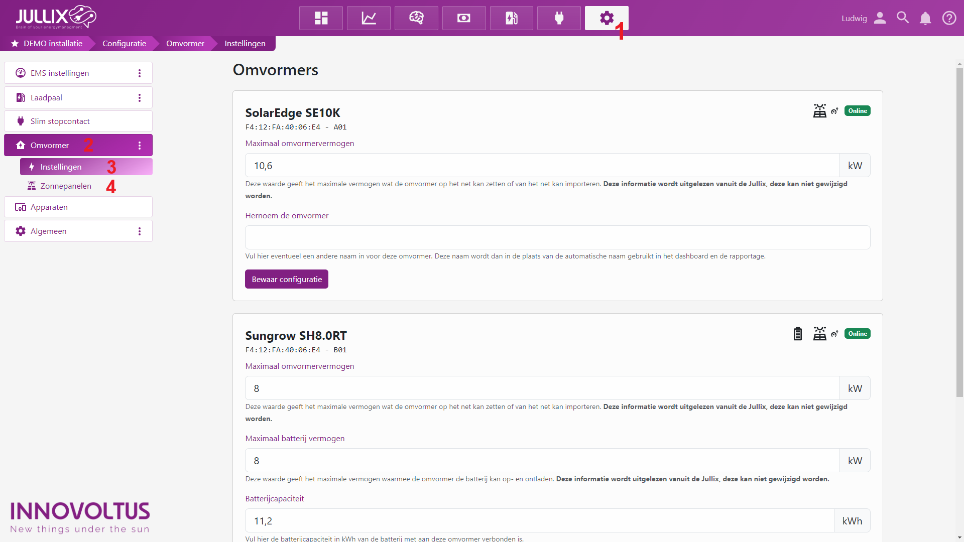 De omvormers die zijn toegevoegd aan de installatie kan je nog instellen. Hiervoor gaan we in de configuratiepagina (1) van de installatie, naar Omvormer (2). Je kan de ligging van de zonnepanelen(4) instellen. Afhankelijk van het type omvormer kan je bij Instellingen (3) nog een aantal items instellen zoals de batterijgrootte en de batterijkost.
