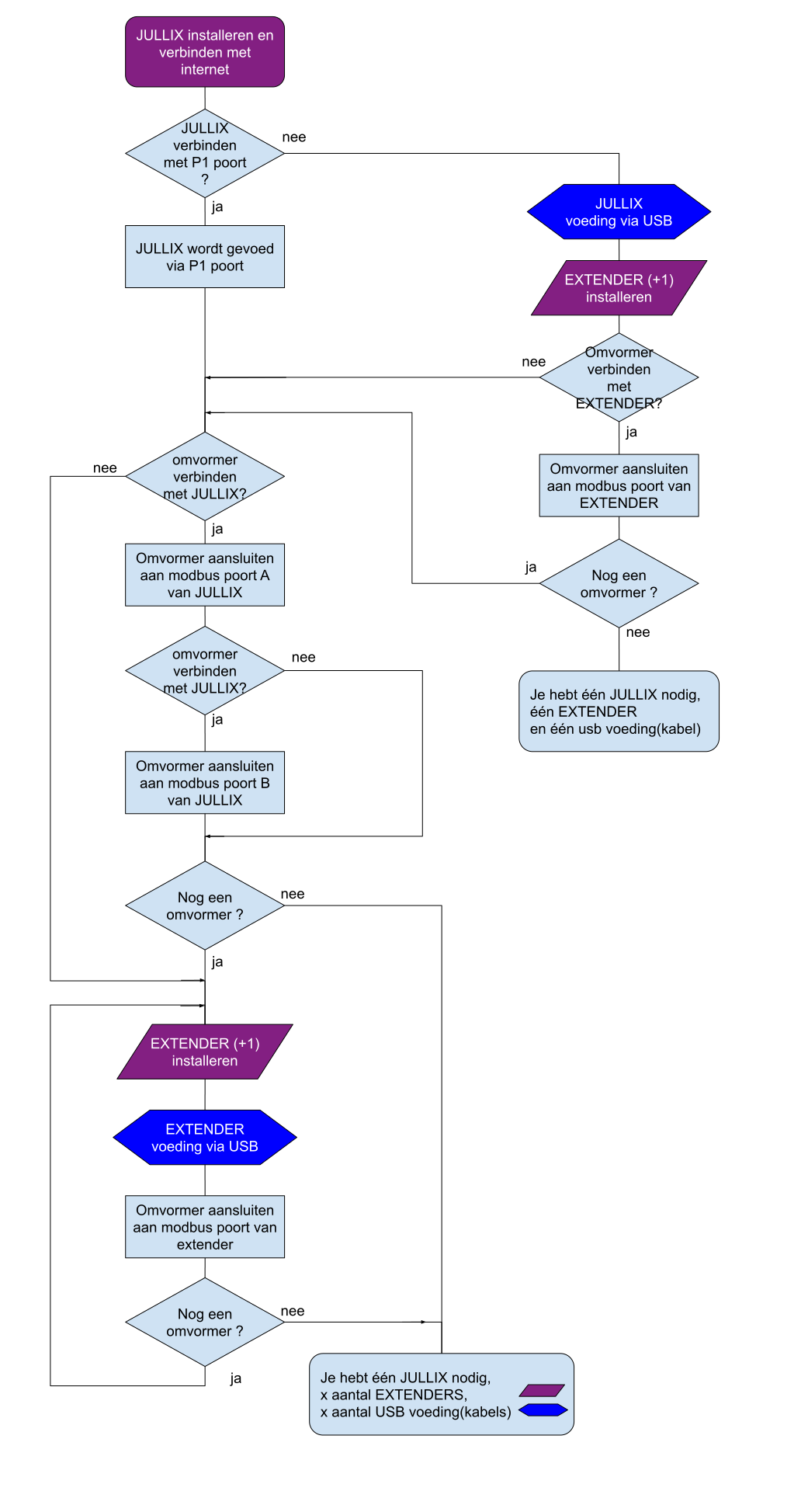 Wanneer de installatie zich niet in één ruimte bevindt, of niet via een kabel verbonden kan worden, kunnen Jullix Extenders ingezet worden. Naast de Jullix worden er dan ook één of meerdere extenders gebruikt, afhankelijk van de situatie. Deze Extenders worden dan via een eigen wifi netwerk rechtstreeks verbonden met de Jullix. De Jullix moet via een kabel aan het internet verbonden worden. Hoe je installatie er kan uitzien, hoeveel extenders je nodig hebt, en hoeveel USB voedingen je nodig hebt kan je met behulp van het flowchart bepalen.